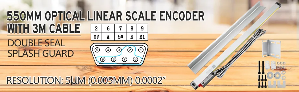 The Linear scale applies intelligent chip with travel length 0-550mm, high accuracy 5um, grating pitch: 0.02mm, response speed: 60m/min. 100% brand new and high quality. Connector: 9-Pin connector (Pin-26789), 2 to 0V, 6 to A, 7 to 5V, 8 to B, 9 to R1.