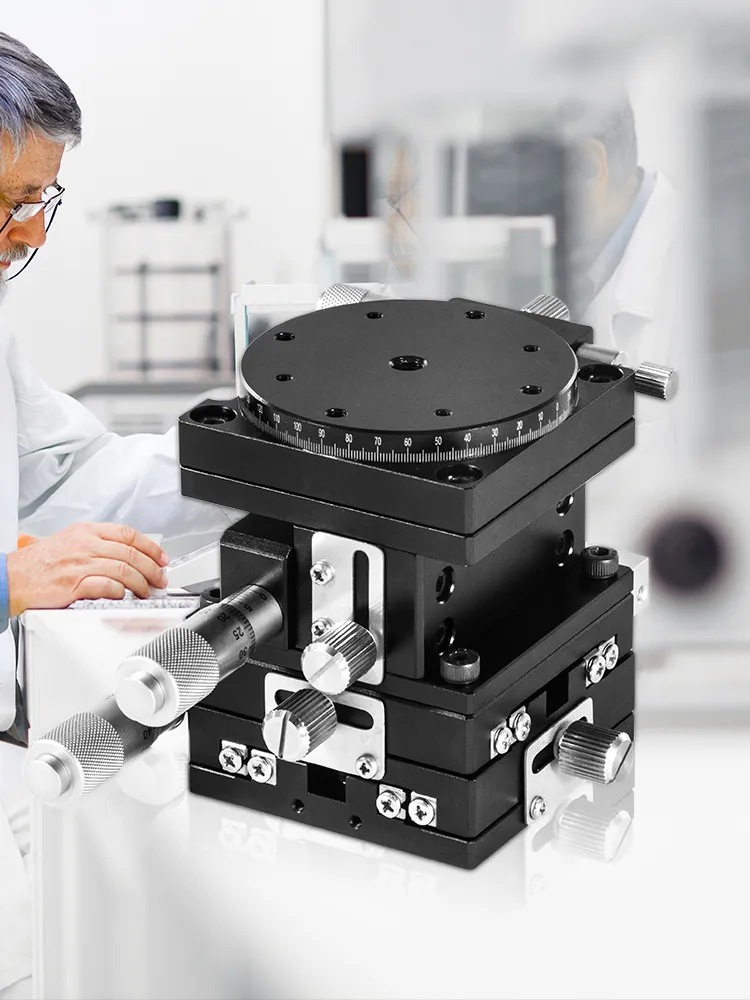 The 4-Axes optical stage is designed with micrometer heads for accurate position. The micrometer heads have a precise scale, and the minimum scale is 0.01 mm.