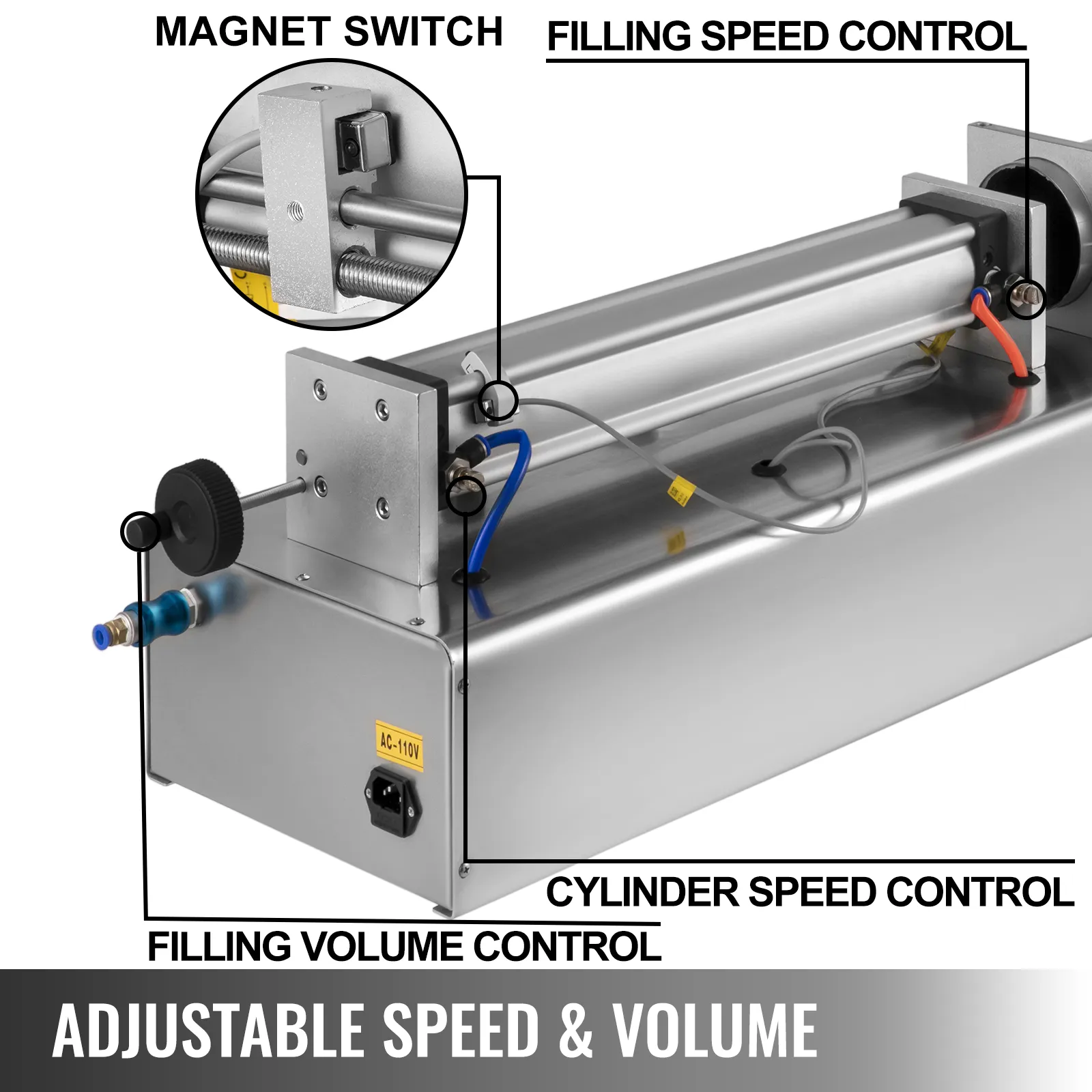 With great power and stable air pressure, the air cylinder supports the filling process well. The accurate scale ensures high-precision filling. Filling volume and speed can be arbitrarily regulated.
