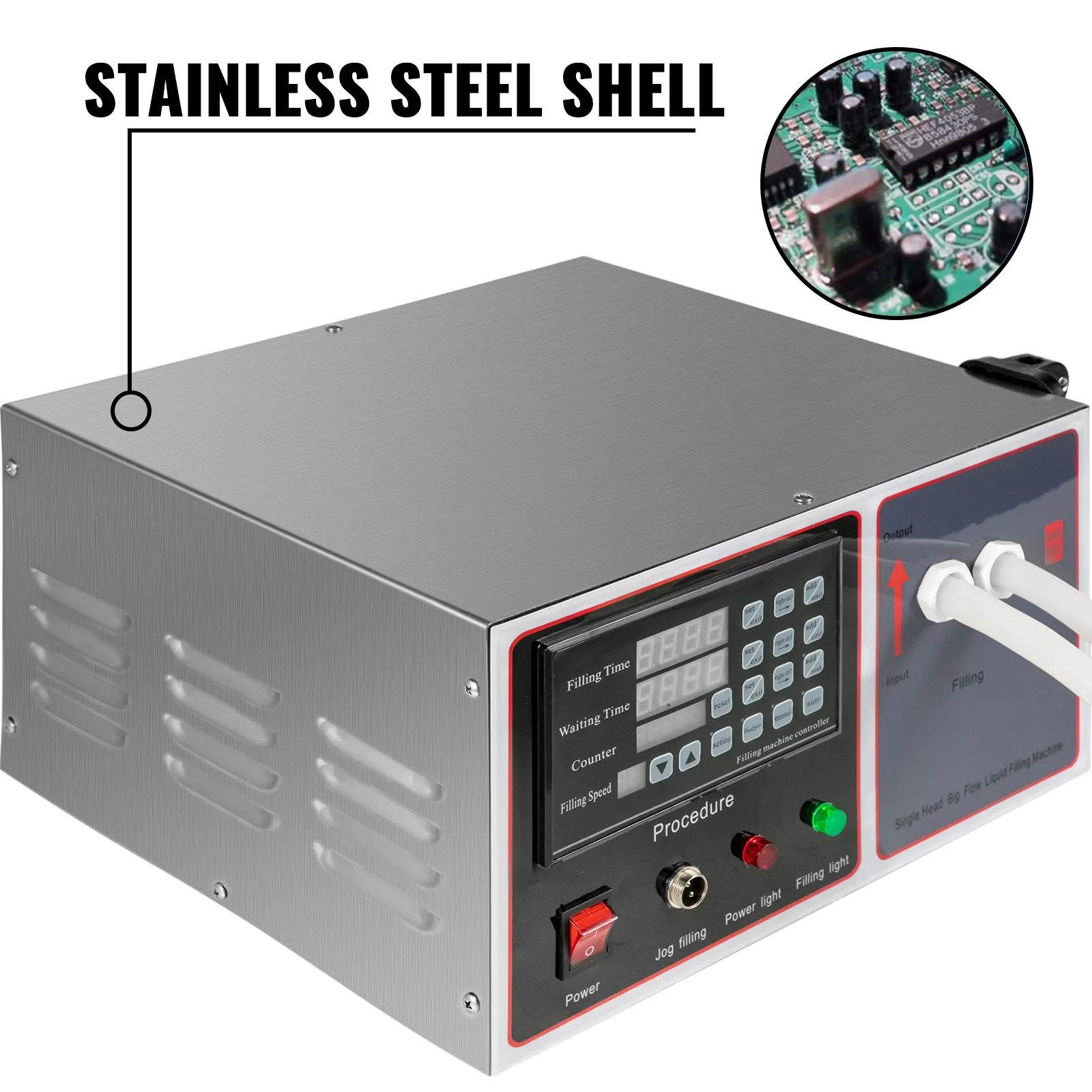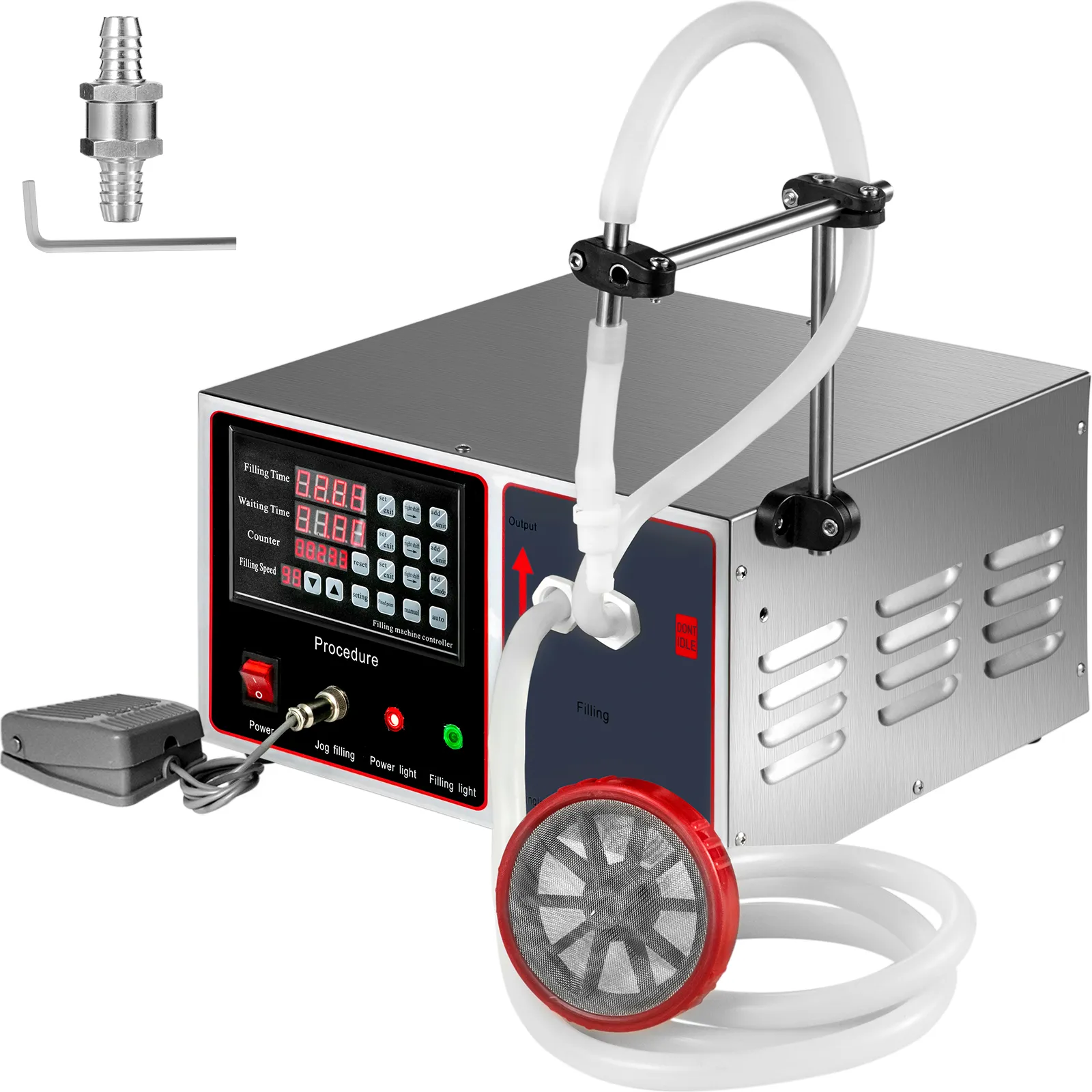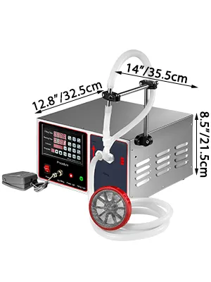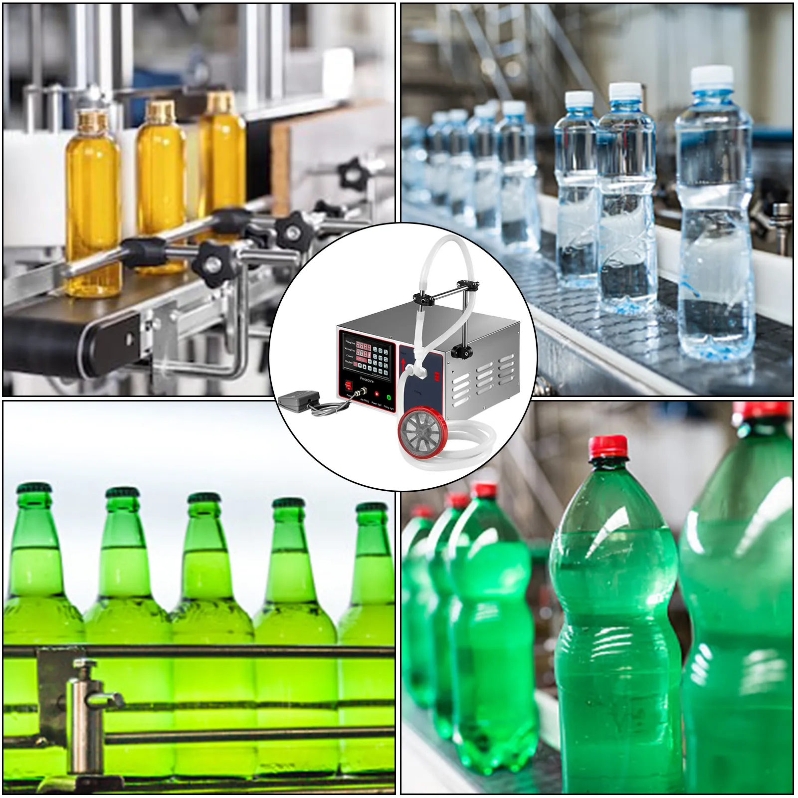 The digital liquid filling machine has a self-prime pump, convenient and efficient. It uses a micro-computer to control the mini-pump on filling time and the electric motor's rotation rate so that the machine can fill the liquid fluently and at high accuracy. It can fill different types of clear thin liquid, including water, olive oil, drinks, vinegar, milk, liquid skincare products, perfume, and other liquid products.