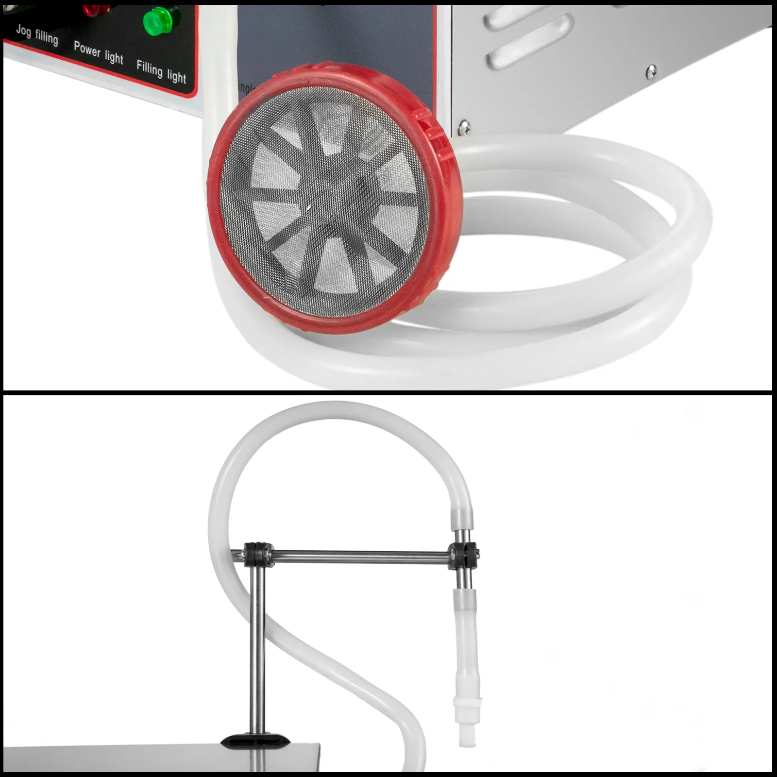 The discharge nozzle and pipe are premium and anti-dripping for high filling accuracy. The filter mesh at the inlet is used to filter the impurity. The stand is adjustable to adapt to different-sized bottles.