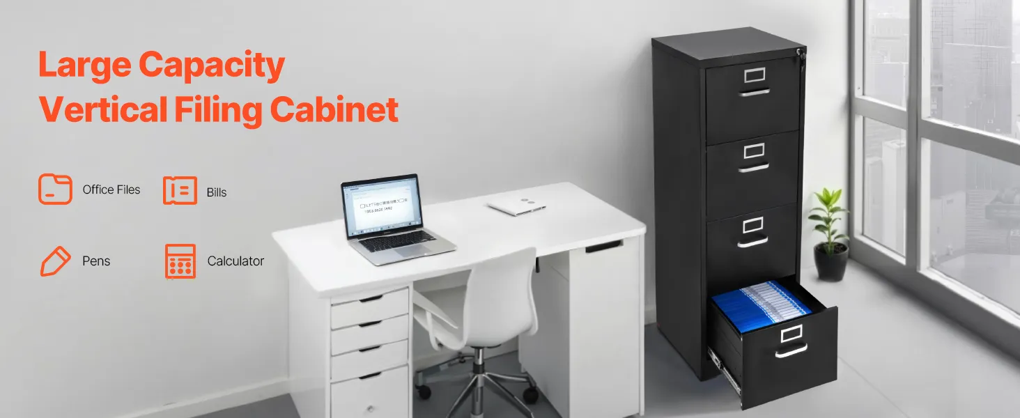 Large Storage Capacity: This 4-drawer file cabinet offers spacious storage, easily accommodating daily office documents, contracts, invoices, and A4-sized materials, helping keep your desk neat and organized.