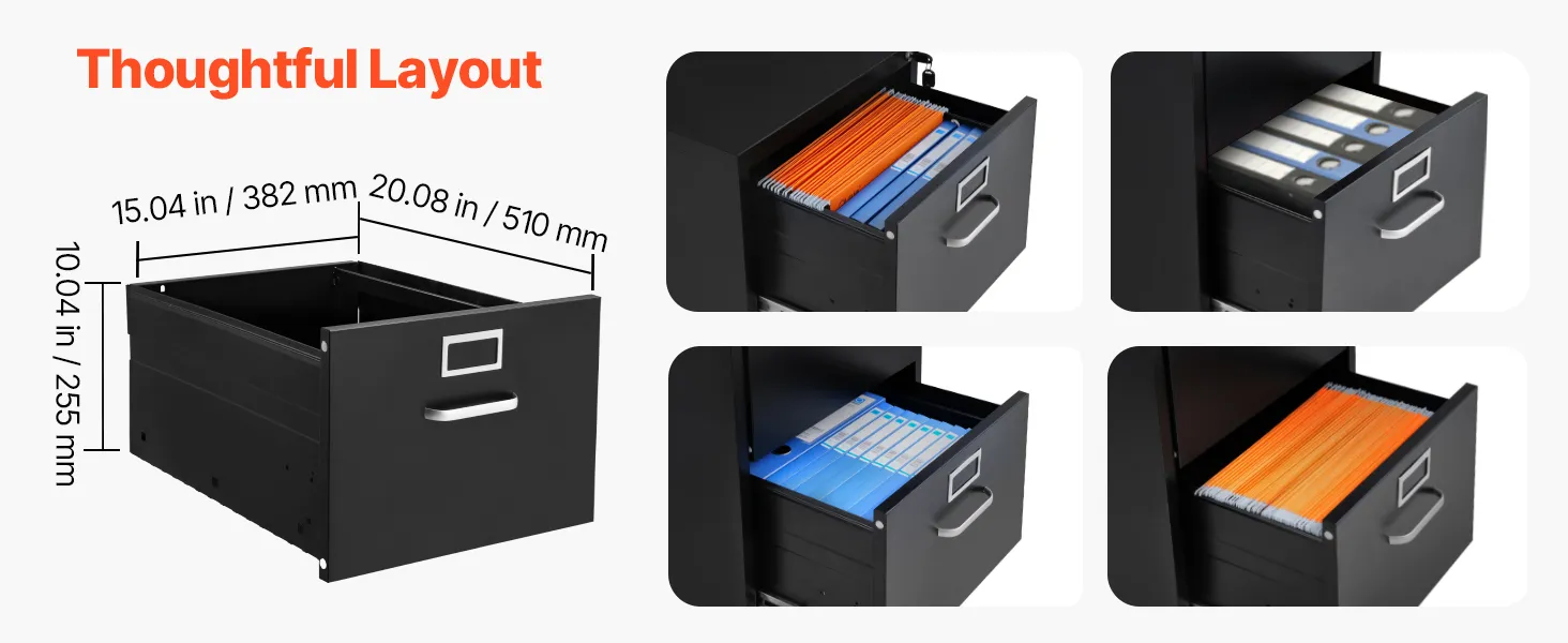 Rational Layout: Our metal file cabinet is equipped with drawers that have adjustable hanging rods supporting horizontal hanging of A4 or letter-sized folders for easy categorization and access. This improves file management efficiency and makes your work easier.