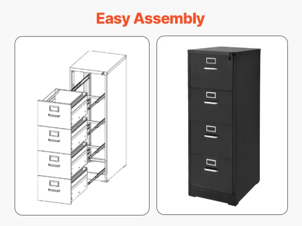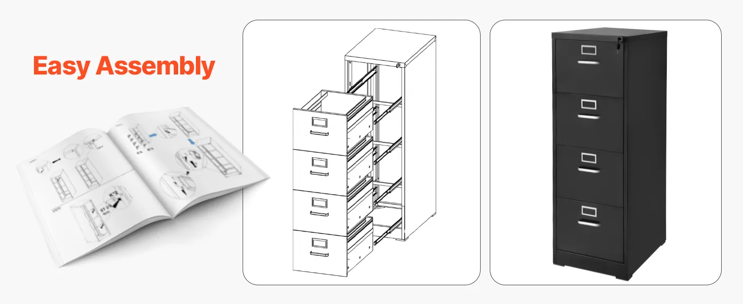 This locking file cabinet comes with a detailed assembly manual and a user-friendly design that saves installation time, allowing for quick setup and use.