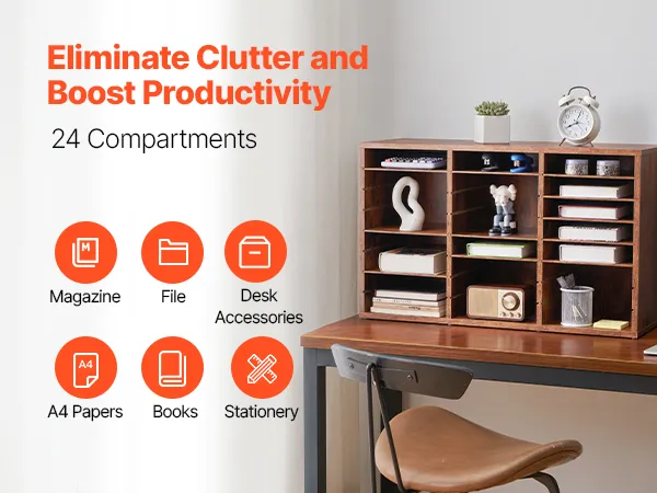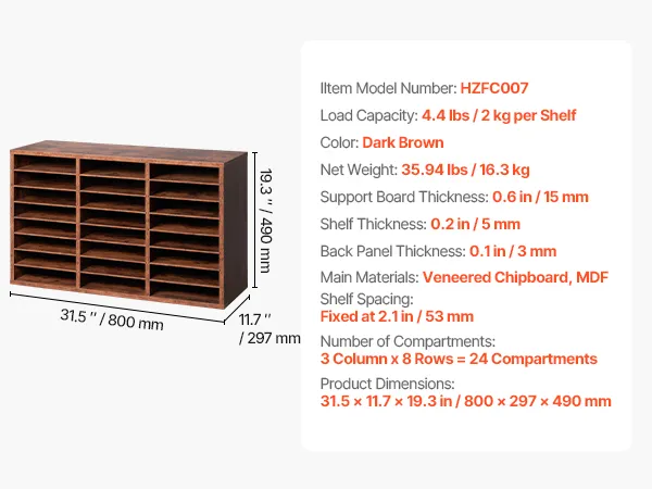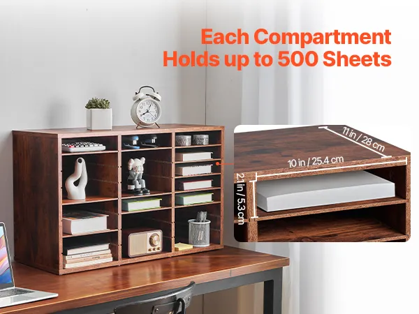 VEVOR Literature Organizer, 24 Compartments Office Mailbox with Removable Shelves, Wooden Mailbox Sorter Particle Board Office Home Classroom Storage, File Sorter for Documents, Papers, Dark Brown