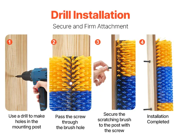 Equipped with two sets of screws—bolts and nuts, expansion screws, and self-tapping screws—it offers versatile installation options. The livestock scratch brush stays firmly in place, even with heavy use.