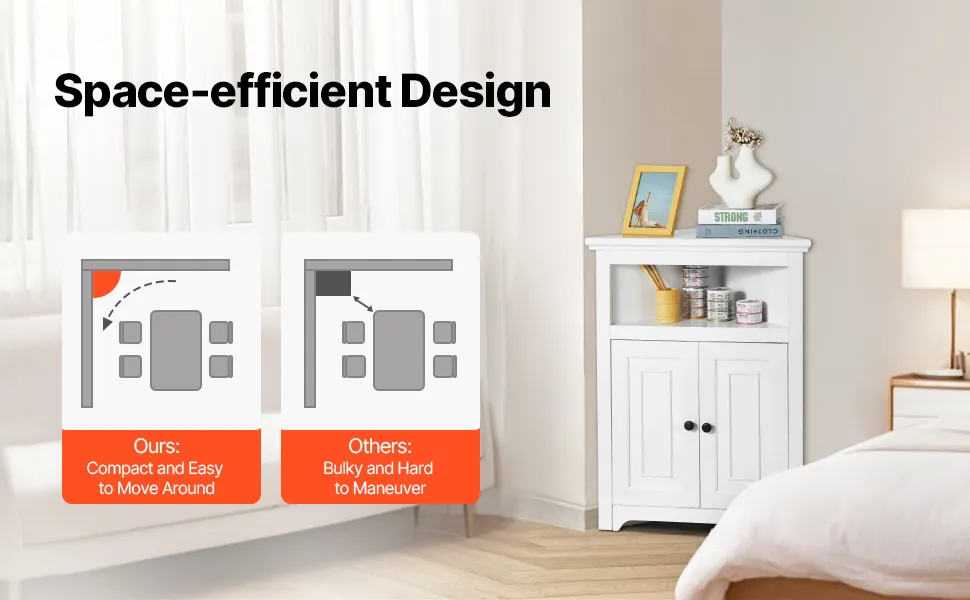 Designed with a triangular pillar shape, this corner shelf cabinet makes full use of small corners, providing more storage space without taking up valuable living space.