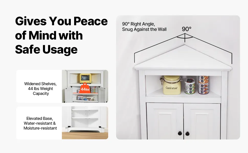 The cabinet fits securely in the corner with right-angle edges that hug the walls, ensuring stability. The thickened shelves can support up to 44 lbs/20 kg each, so you can confidently store heavier items like a small toaster oven. The elevated base is designed to be waterproof & moisture-resistant.