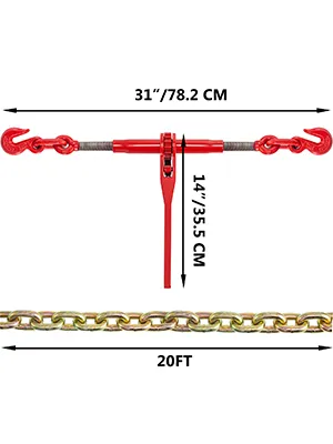 3T Loading Capacity: The chain load binder has an excellent loading capacity of 3 t. Breaking Strength: 12 t. The chain, 8 mm in diameter and 6 m in length, has a breaking strength of 80.4 KN, built for most industrial jobs.