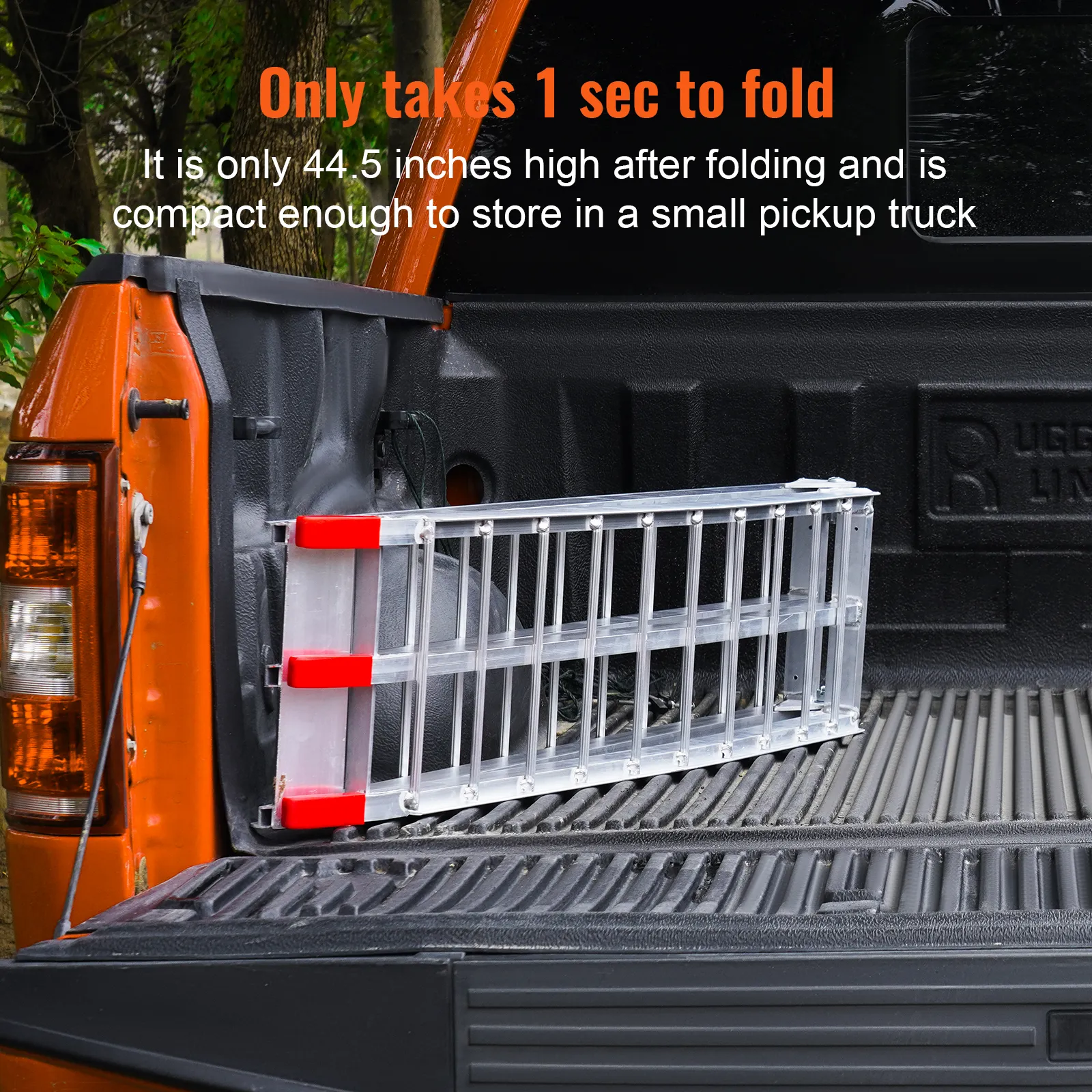 These ramps have a compact and foldable design, which makes them easy to store and transport. When folded, they measure only 44.5 inches long. The compact size allows them to fit easily in small spaces. You can transport them in your truck or trailer without taking up much room. Because the ramps are lightweight, it's easy for you to move and set them up. They’re perfect for those who frequently need to move their ramps. Quickly and easily set them up for use, then fold them back up as storage.