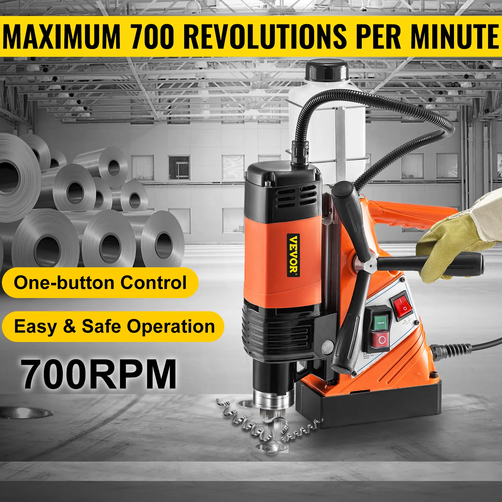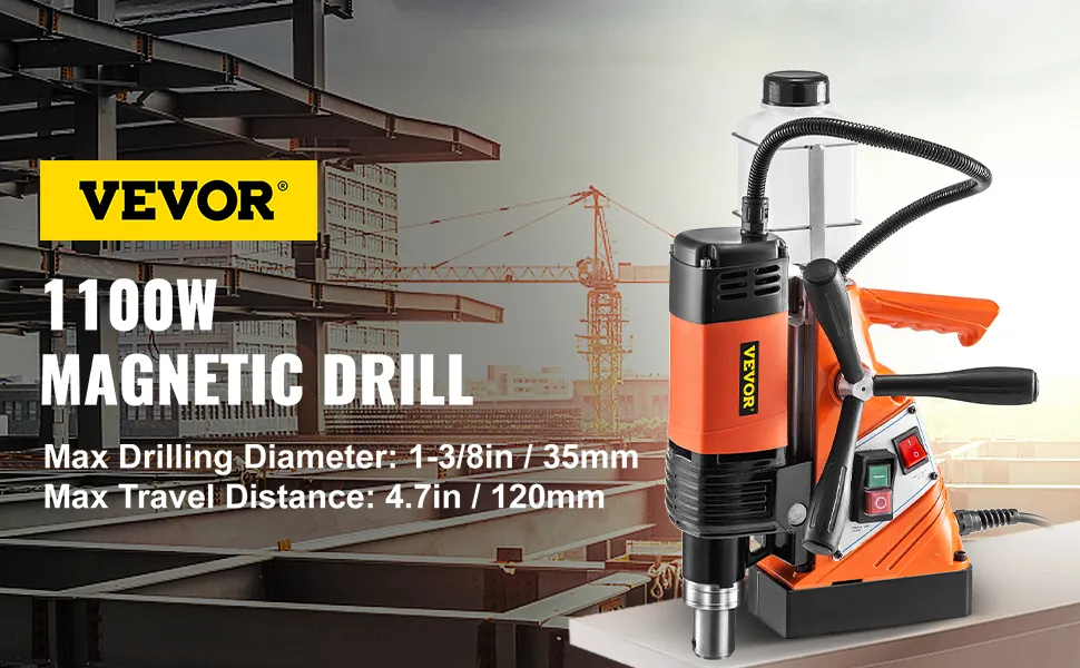 Superior Performance: Our portable drill press generates exceptionally strong power thanks to its 1100W copper motor. It is capable of drilling into the toughest materials at 700 RPM. Maximum Coring Diameter: 1-3/8" / 35 mm; Maximum Travelling Distance: 4.7" / 120 mm.