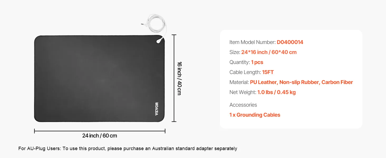 Connect with Earth's Energy: Our grounding mat connects your body to the Earth’s natural energy by channeling negative charges through a grounding outlet. This connection can help improve sleep, reduce pain, and enhance overall health. (For AU-Plug Users: To use this product, please purchase an Australian standard adapter separately)
