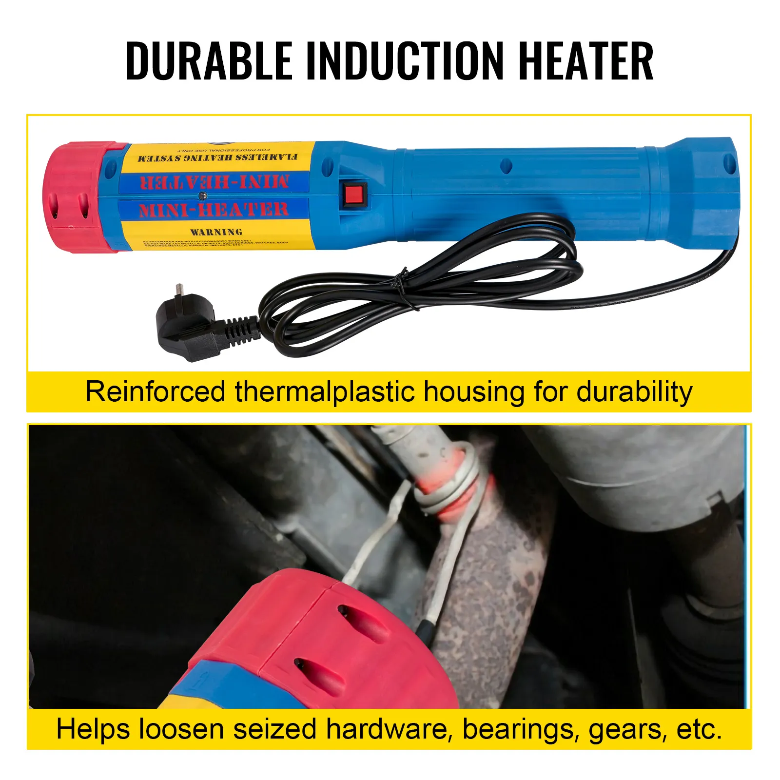 • Reinforced Material: Our magnetic induction heater kit is covered by heat-stabilized thermoplastic housing; this increases its durability inside and out. It is an ideal tool for loosening seized hardware, bearings, gears, pulleys, lug nuts, etc.