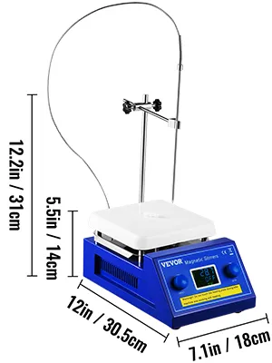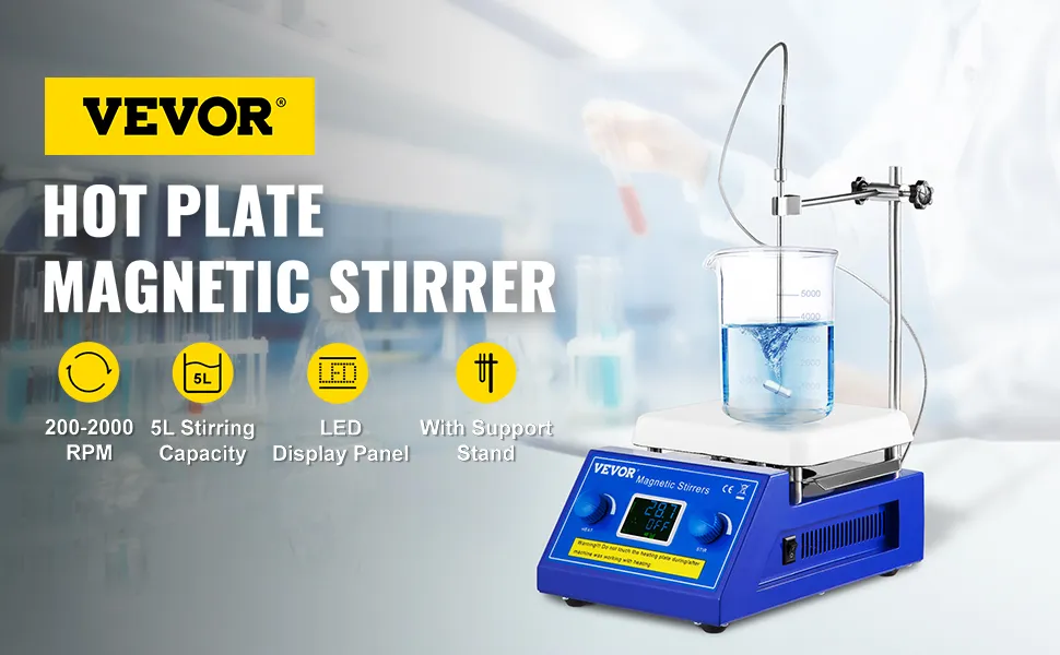 This lab hot plate magnetic stirrer incorporates an electric heating plate for more efficient stirring. Ceramic-coated heating plate heats samples quickly and uniformly. The stirring speed can be adjusted to 2000 RPM for more efficient stirring. LED digital display, dual control knob, and temperature probe sensor give precise temperature and speed control. This scientific hot plate magnetic stirrer is ideal for scientific research, laboratory study, college experiment, and industrial research.