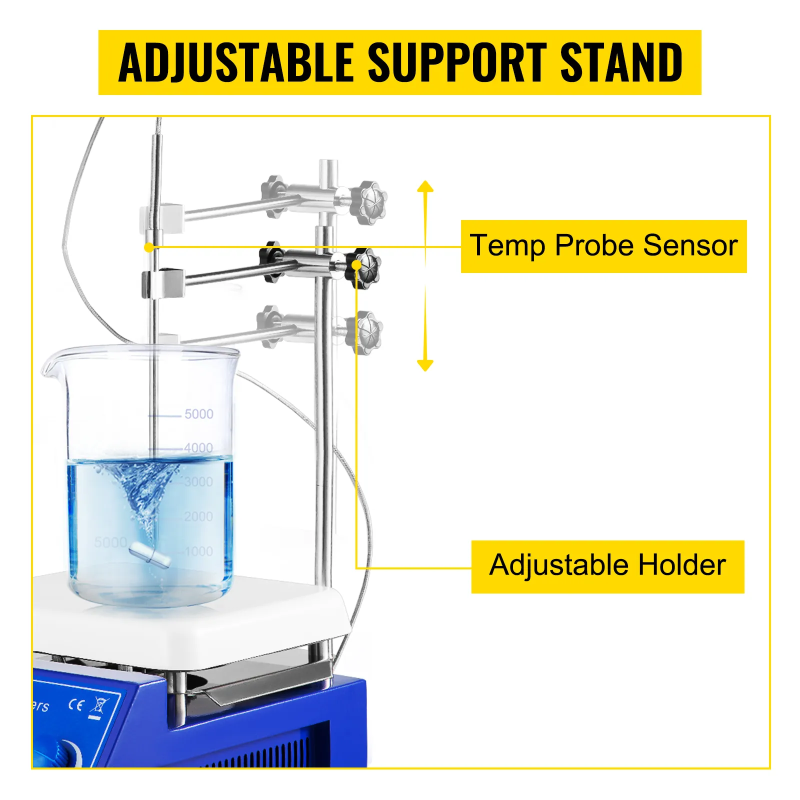 This heating plate magnetic stirrer includes a support stand with an adjustable holder, holding the temperature sensor to precisely control and monitor the temperature.