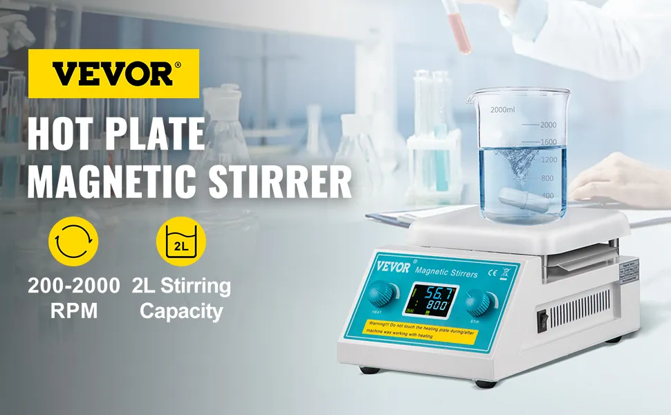 The stirring speed of the hot plate magnetic stirrer can be adjusted between 200 and 2000 RPM for different needs. The maximum speed can reach up to 2000 RPM for a quick solution stirring. 2L stirring capacity allows for large volume stirring.