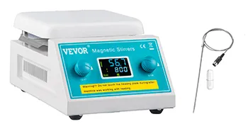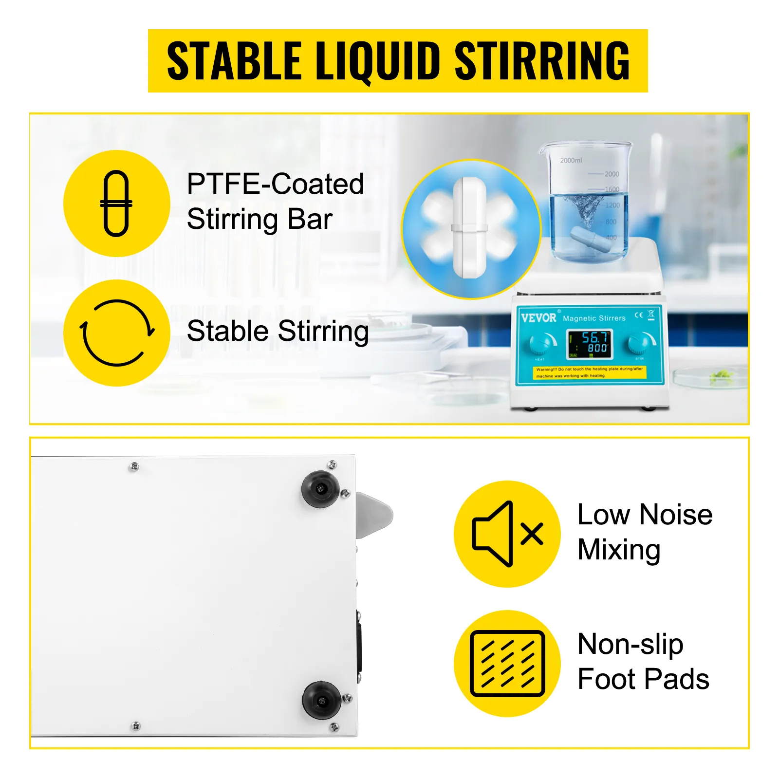 The stirring bar is coated with Teflon, which is not easy to rust when immersed in the liquid. Also, with the non-slip foot pads, the magnetic hotplate stirrer can be placed stably on the table.
