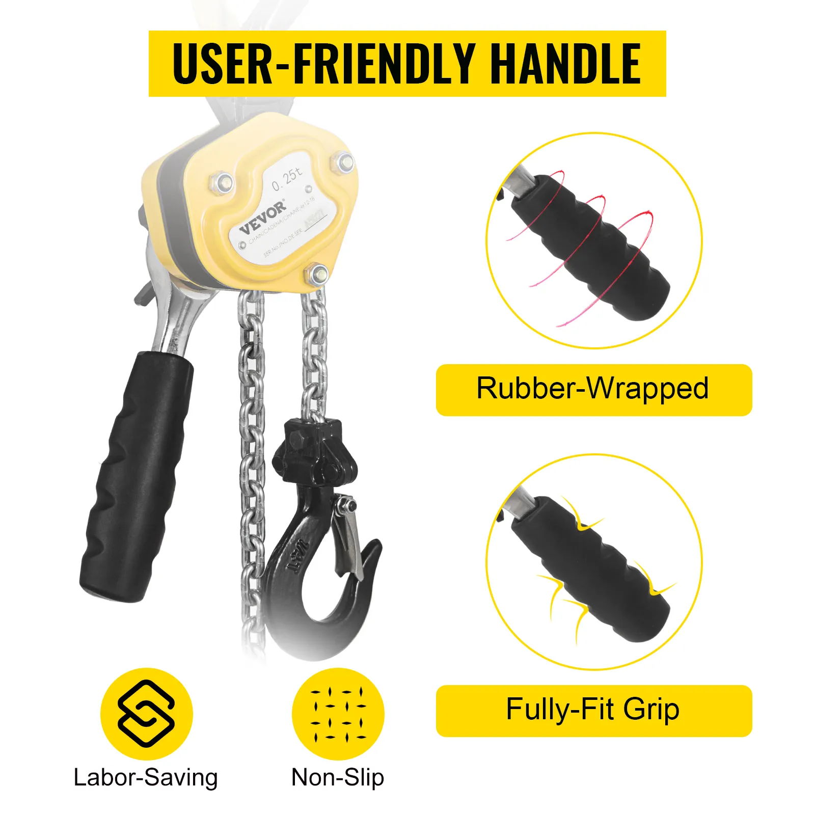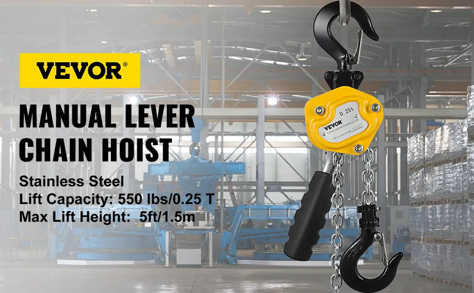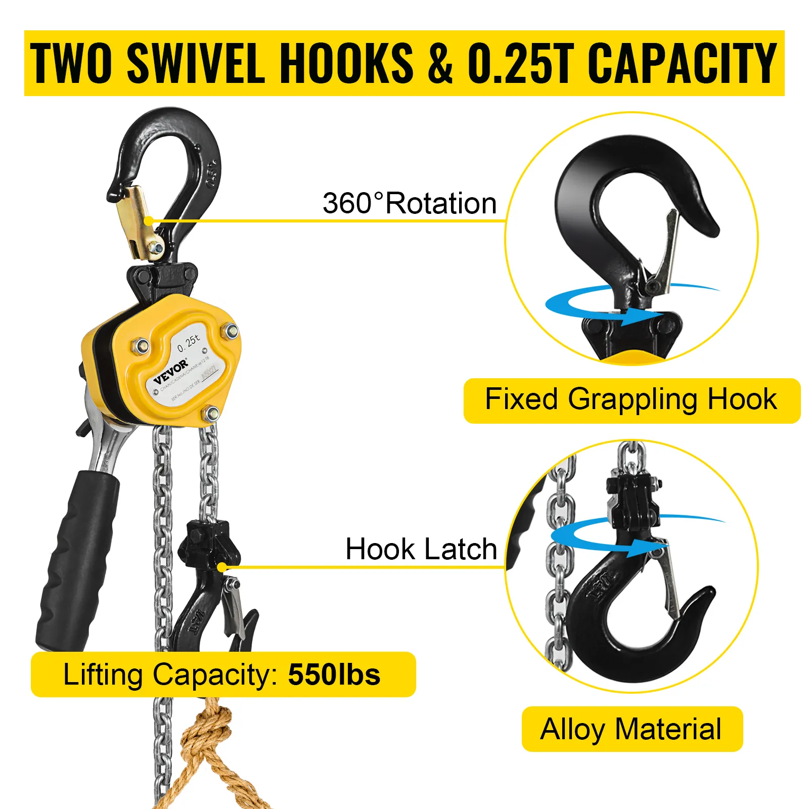 Durable Construction & 550 lbs: Made of solid carbon steel, which has outstanding resistance to impact and oxidation, this chain hoist has been designed for prolonged use. It is also easy to carry with a simple structure and small size. 0.25T lifting capacity.
