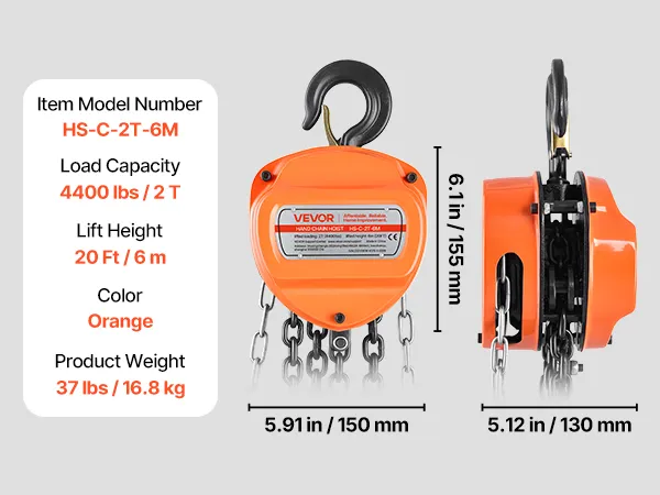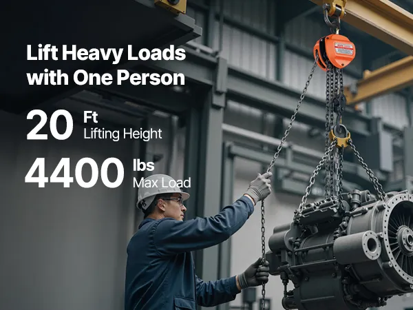 4400 lbs Heavy Duty Capacity: This hand chain hoist easily handles heavy lifting tasks, supporting up to 4400 lbs (2 T) and reaching heights up to 20 ft (6 m). Ideal for garages, construction sites, and warehouses