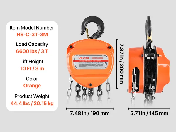 6600 lbs Heavy Duty Capacity: This hand chain hoist easily handles heavy lifting tasks, supporting up to 6600 lbs (3 T) and reaching heights up to 10 ft (3 m). Ideal for garages, construction sites, and warehouses