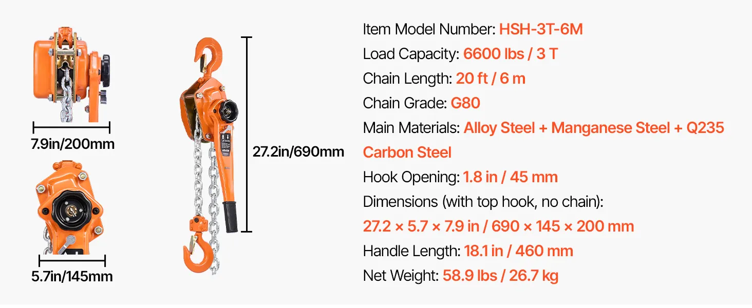 3T Max Load: This manual lever hoist features an all-steel construction that resists-impact and breakage, allowing one person to effortlessly move loads up to 3T / 6600 lbs. Ideal for dragging fallen trees, lifting steel beams, machinery, engine parts