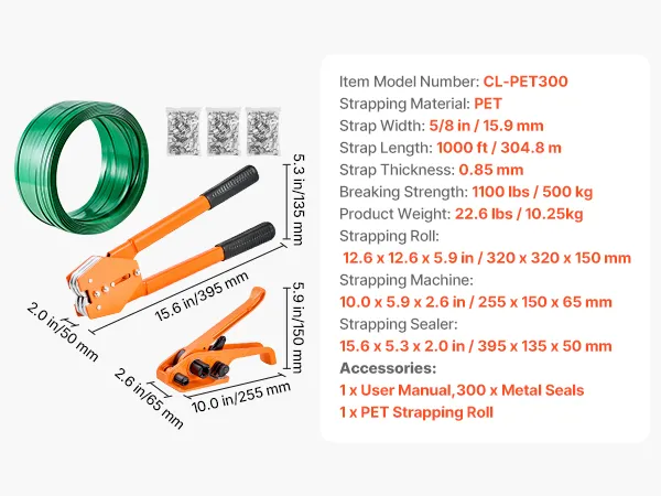 Our strapping kit includes 1 strapping tensioner, 1 heavy-duty strapping sealer, 300 metal seals, and 1 roll of PET strapping band. The strapping band is 1000 ft / 304.8 m, providing ample usage. This complete strapping tool set meets all your daily packaging needs!