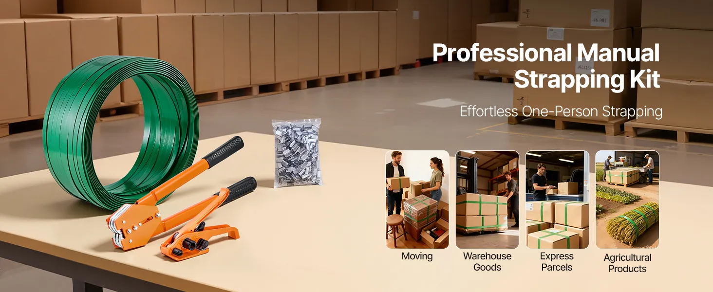 Manual Strapping Sealer: This is a heavy-duty manual banding strapping kit, equipped with an extended handle. It enhances strapping force through labor-saving lever operation and supports 5/8 in /15.9 mm wide polyester (PET) strapping