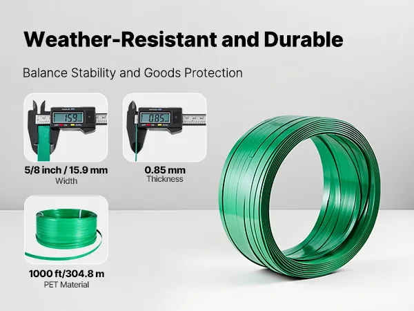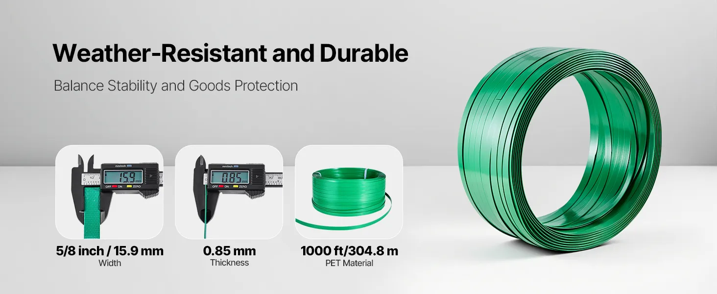 High-Quality PET Strapping: The strapping kit has a green embossed surface and is a hand-grade PET strapping. It can be sealed via seals, heat fusion, or friction welds. High-strength polyester has excellent stretch resistance for strapping bricks, lumber and textiles