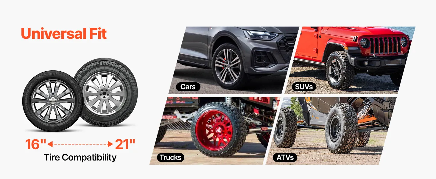 Fits 16"-21" Tires: Easily adjust the duck head position to adapt to tires ranging from 16" to 21" (406-533 mm). The tire changer adapter is universally suitable for tires on cars, SUVs, trucks, UTVs, ATVs, and other vehicles