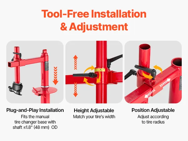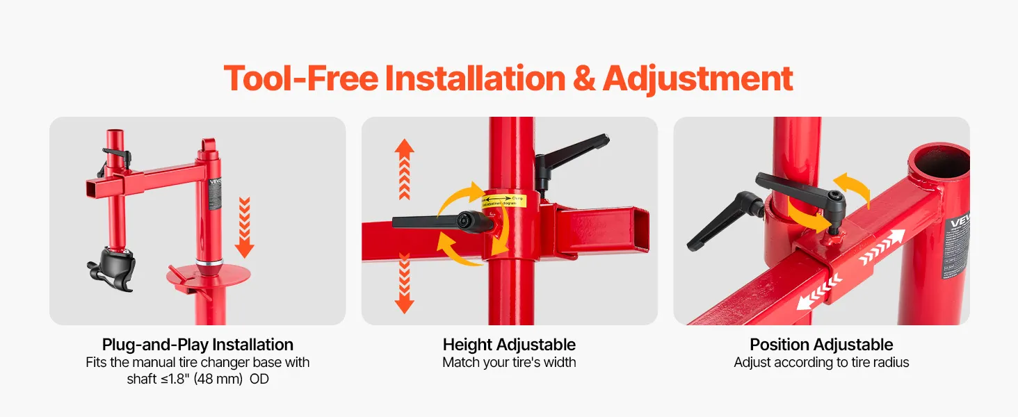 This manual tire changer requires no professional skills for quick assembly onto the tire changer base. Easily adjust the position and securely tighten with screws to fit your tire size.