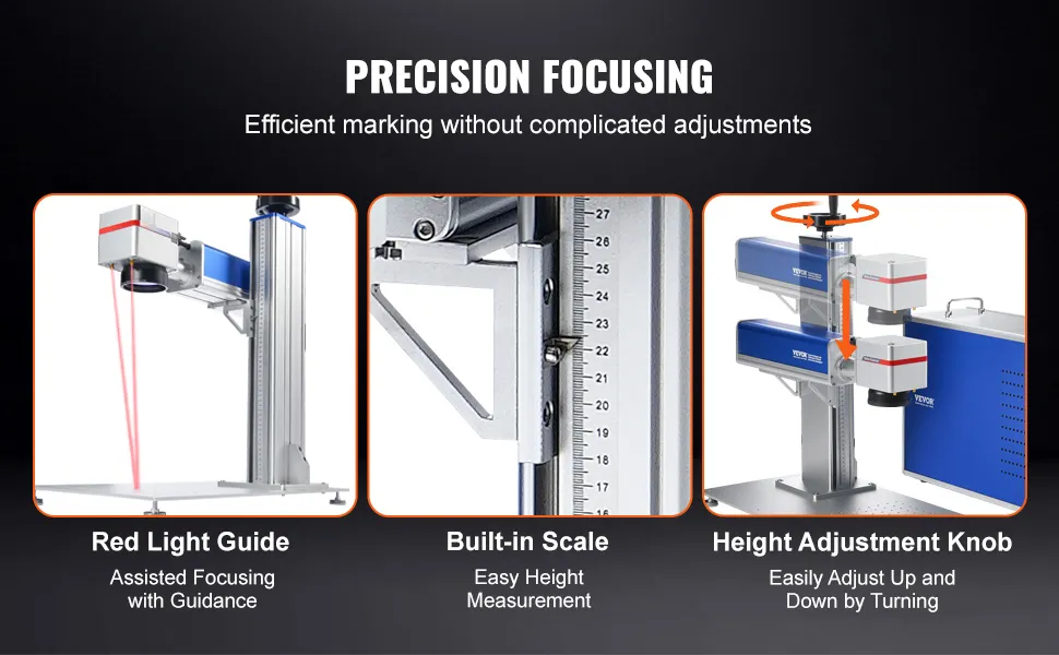Accurate Focusing: Our laser marking machine is equipped with a red light auxiliary focusing system and an adjustable-height galvanometer. This setup enables quick focus adjustments for your efficient and precise engraving.