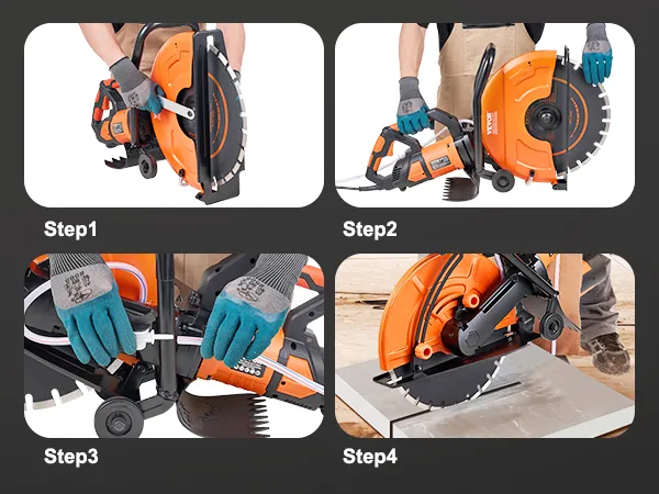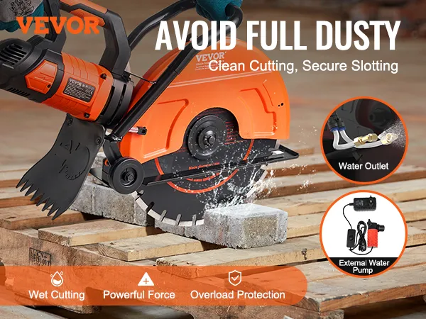 A Clean Wet Cut: The VEVOR electric concrete saw offers a better cutting experience and reduces body damage by preventing debris from spreading during cutting operations. It also includes a wet-cutting attachment, which provides direct water spraying and eliminates the need for one-handed watering while cutting. This improves operational security and makes cutting easier.