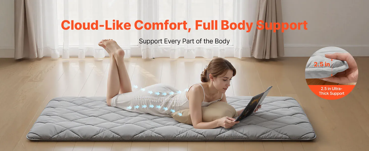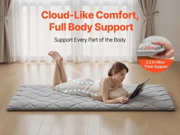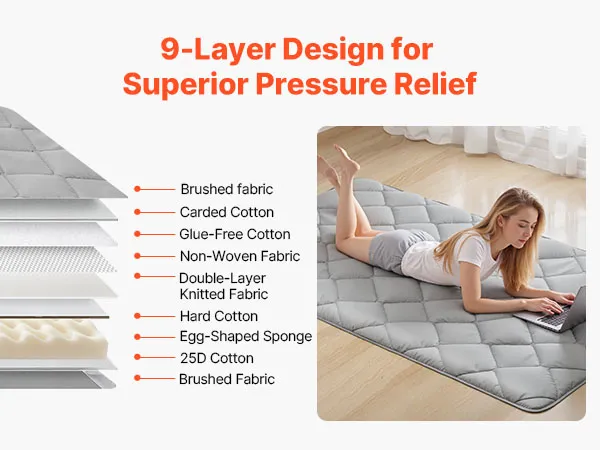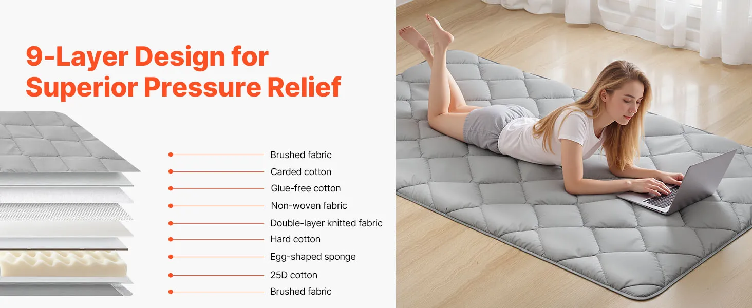 Thickened 9-Layer Support: This 2.5 in tatami mat features a 9-layer structure with egg-crate foam and 25D memory foam for balanced support and comfort. Its ergonomic design contours to your body and helps protect your spine for a better night’s sleep