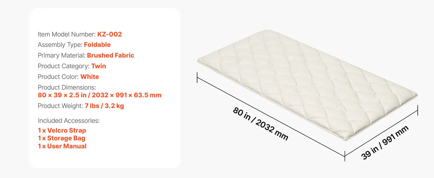 VEVOR Japanese Tatami Mat, Twin Size Foldable Japanese Tatami Mattress, Futon Mattress with Storage Bag & Fastener, 9-Layer Floor Mat for Sleeping, Dorm, Meditation, Yoga, 2032 x 991 x 63.5 mm, White