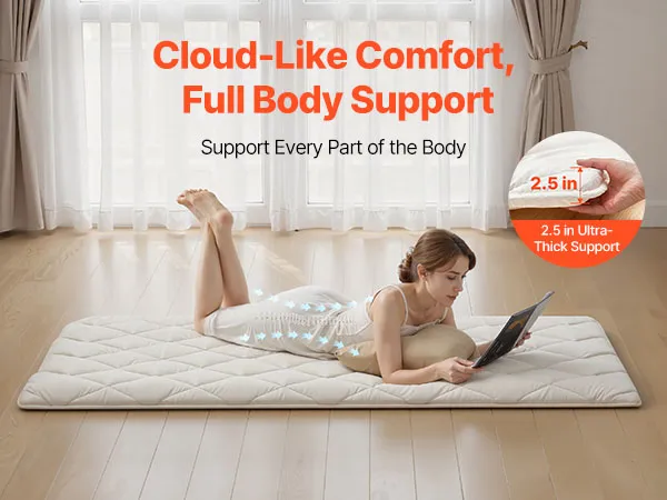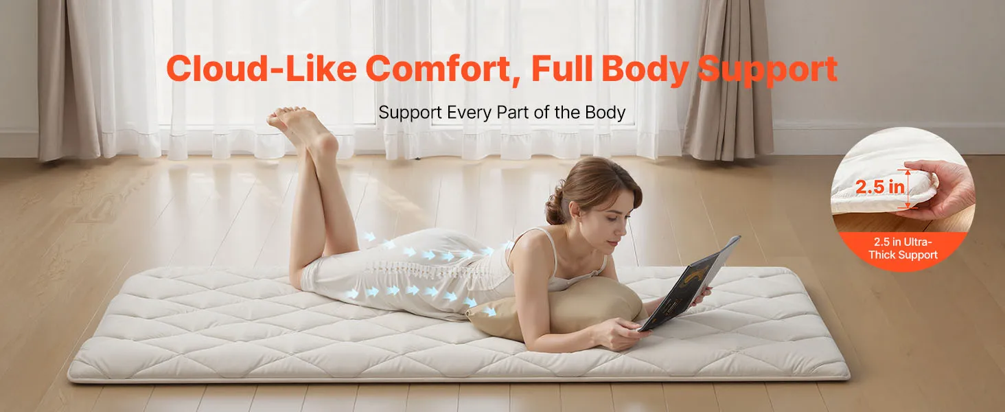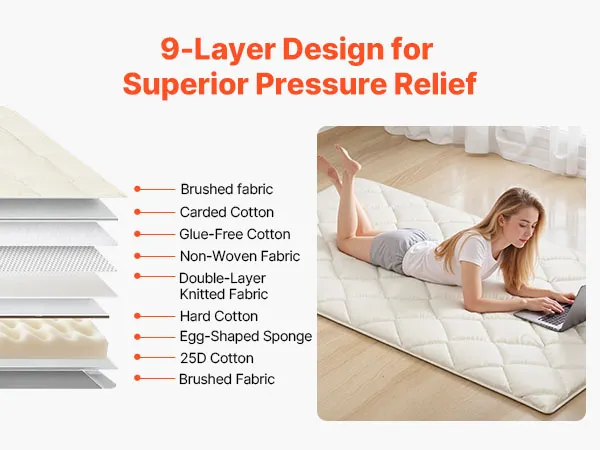 Thickened 9-Layer Support: This 2.5 in tatami mat features a 9-layer structure with egg-crate foam and 25D memory foam for balanced support and comfort. Its ergonomic design contours to your body and helps protect your spine for a better night’s sleep