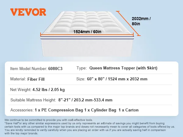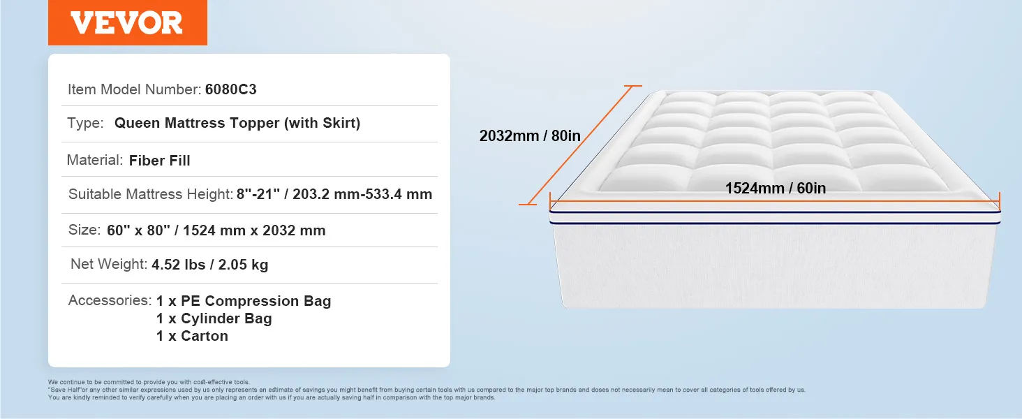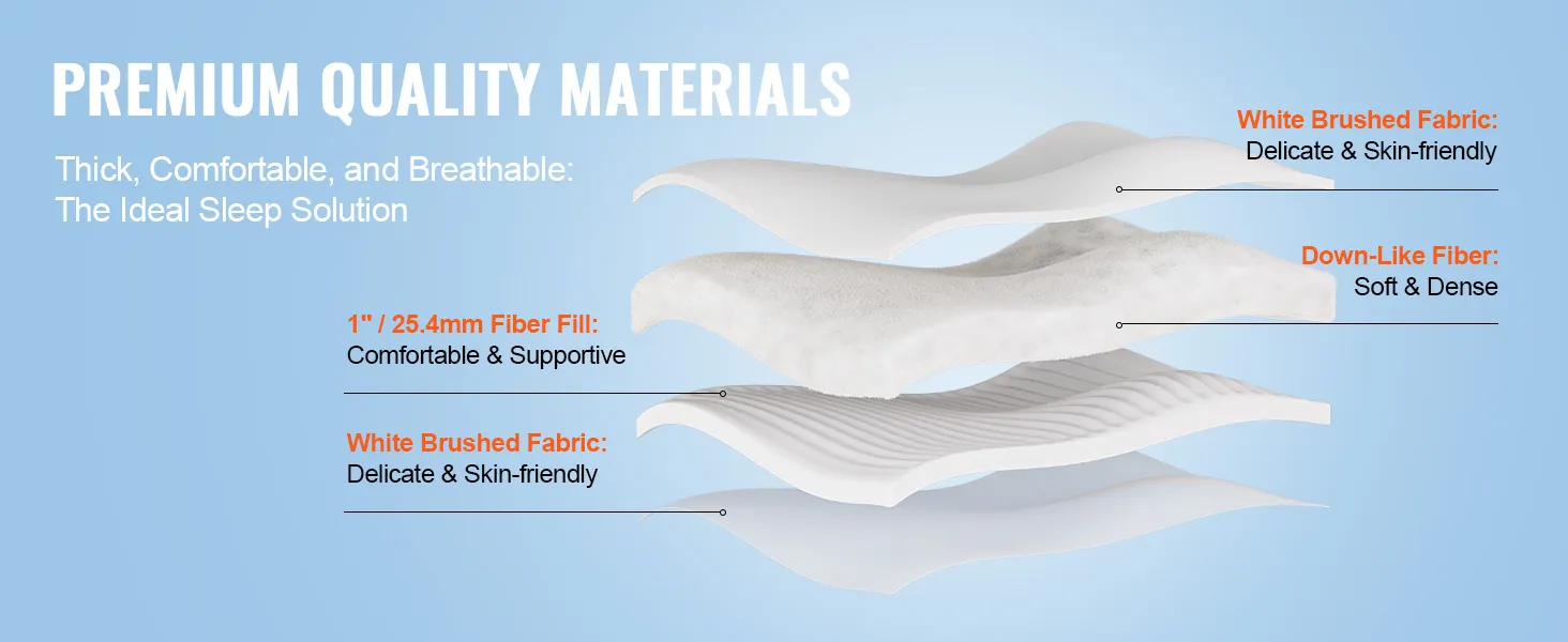 VEVOR Mattress Topper, Queen Size, 25.4 mm Thickness, Fiber Fill Pad with Detachable & Washable, Comfortable, Supportive, Cooling, Breathable, with Detachable Bedside Pocket for Holding Small Items