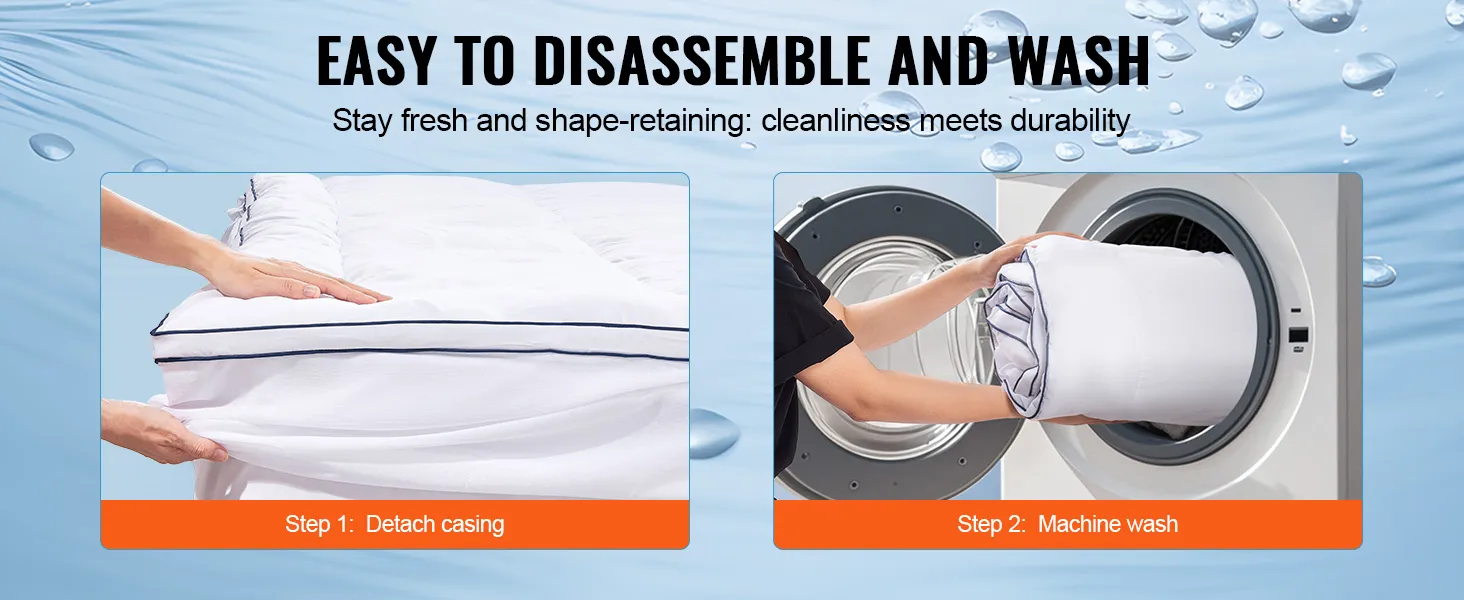 Our mattress topper features a detachable cloth casing and a 360° elastic band, so cleaning is a breeze. No more struggling with bulky toppers—just detach the casing, toss it in the washing machine, and keep your bed fresh and hygienic.