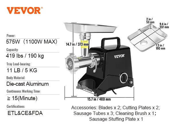 This meat grinder is equipped with a powerful motor and can grind various meat: beef, chicken, turkey, bison, venison, etc. Or use the sausage accessories to make delicious homemade sausages. The die-cast aluminum housing is durable, and the reverse function helps avoid jamming.