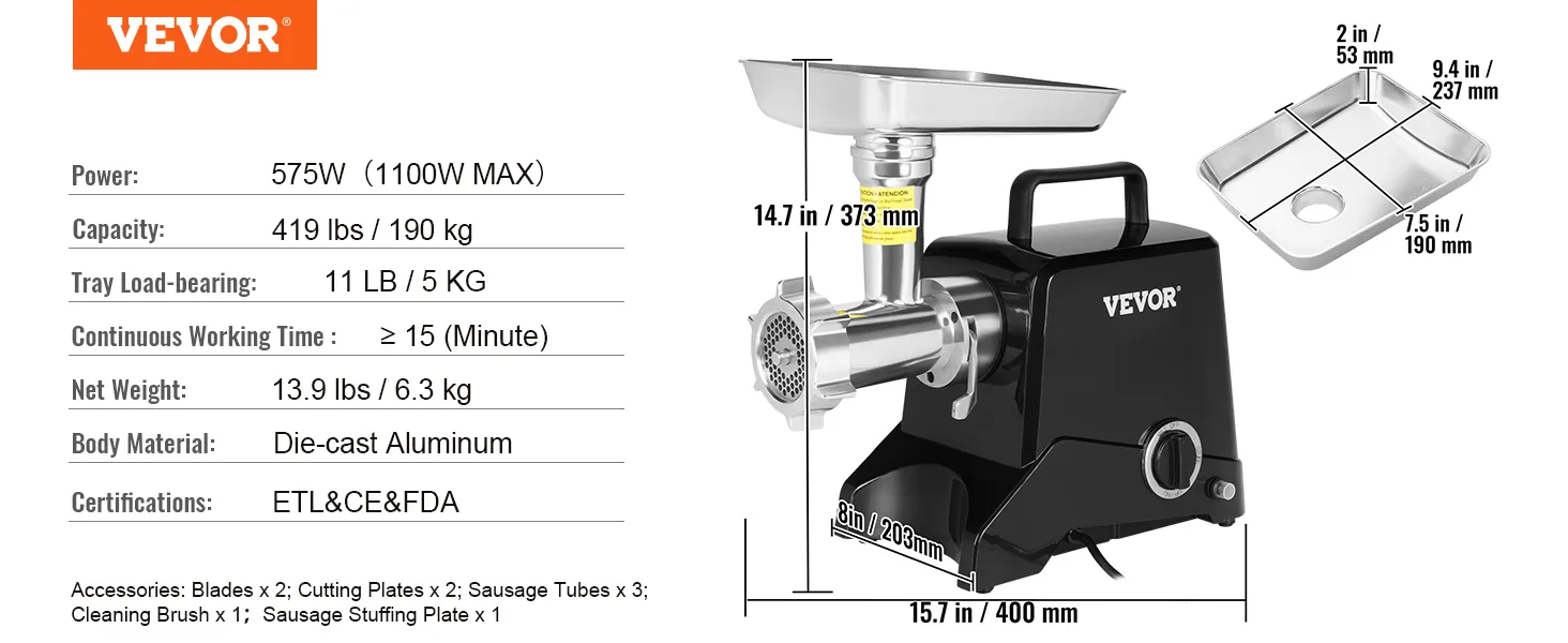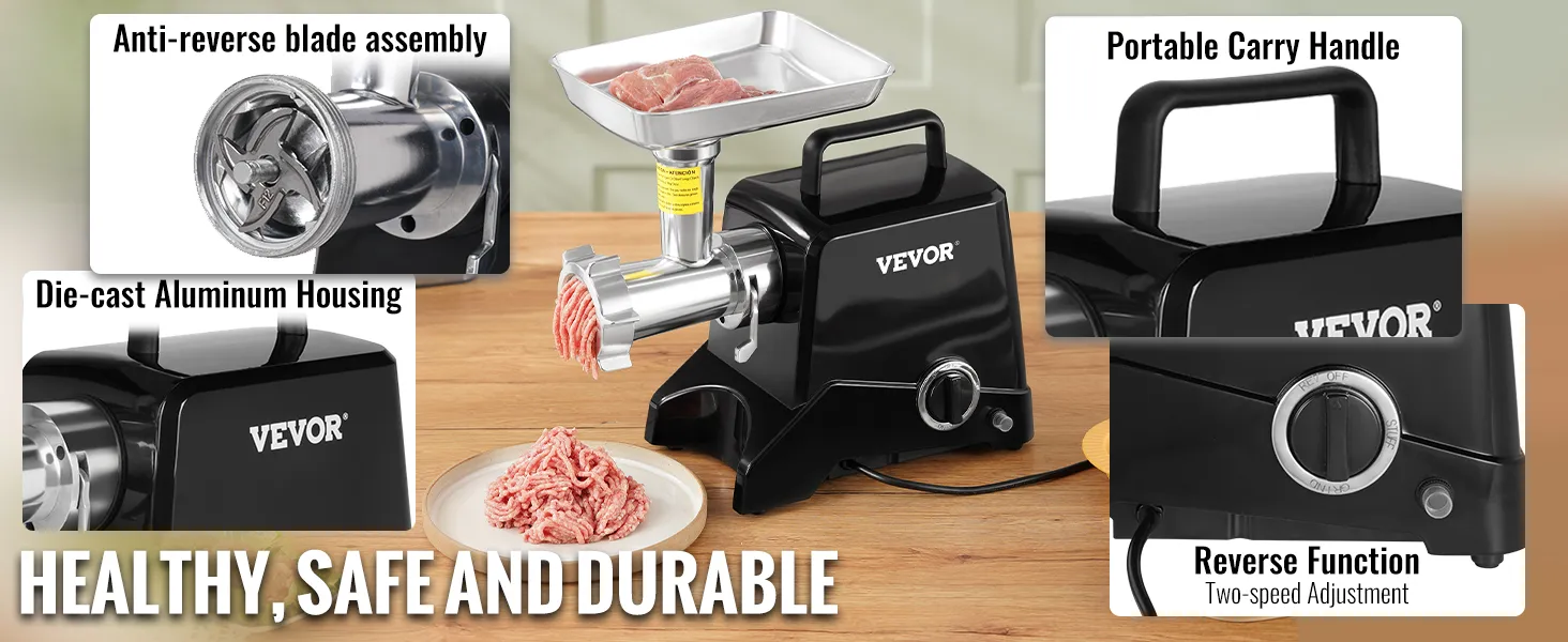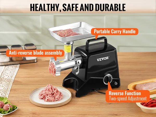Well Built: With aluminum construction, the part in contact with food is made of 100% food-grade material; the anti-backloading setting of the blade helps you to operate correctly, in addition, you can adjust the fast and slow speed; the reversing function helps you get back to normal work quickly when you jam meat; the handle on the top of the machine makes it easy to take it anywhere you want to use.