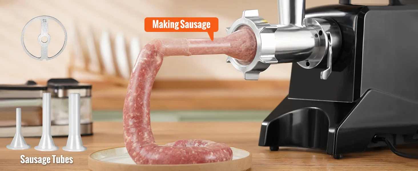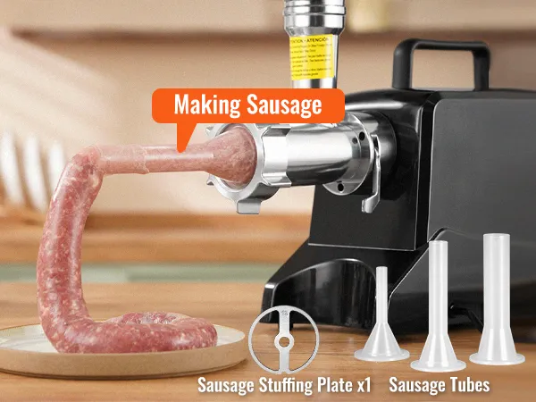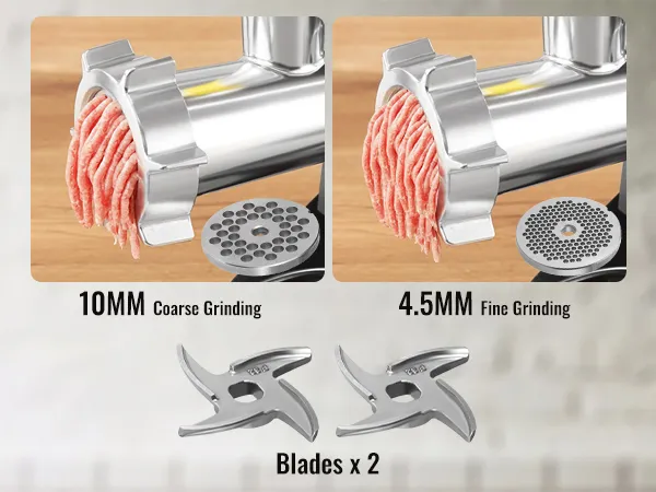 Besides making ground meat, you can also use it to make different kinds of sausages. Include stainless steel blade, cutting plate for coarse and fine grinding of meat, sausage stuffing plate, sausage tube, and a cleaning brush.