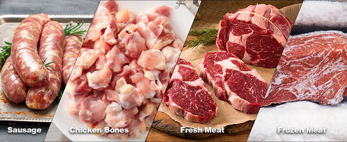 Five-star Helper for Food Preparation: Make quick work of beef, chicken, turkey, bison, venison and other meats in your kitchen with this versatile meat mincer that can even grind chicken carcasses and frozen meat! It can also easily make sausage and kubbe, and can be used in a variety of applications, kitchen, restaurant, food processing store, corporate use, etc. It is the perfect helper for cutting meat. (Please note: It cannot grind thicker bones, such as chicken leg bones.)