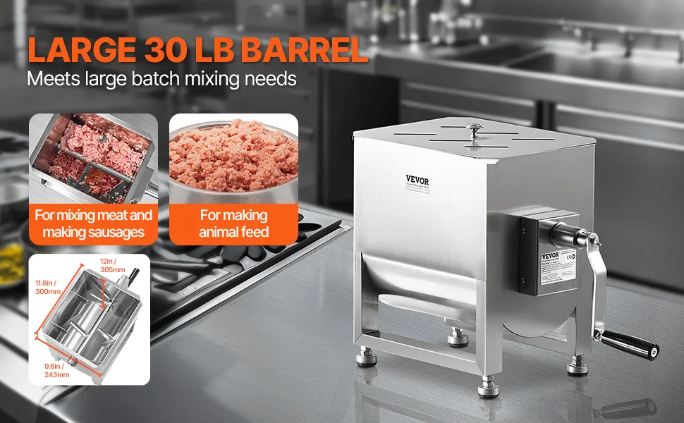 The meat mixer features a 30 lbs capacity tank, ideal for mixing meat with sauces and seasonings. It can be used for making sausages, other delicacies, or even for animal feed preparation.