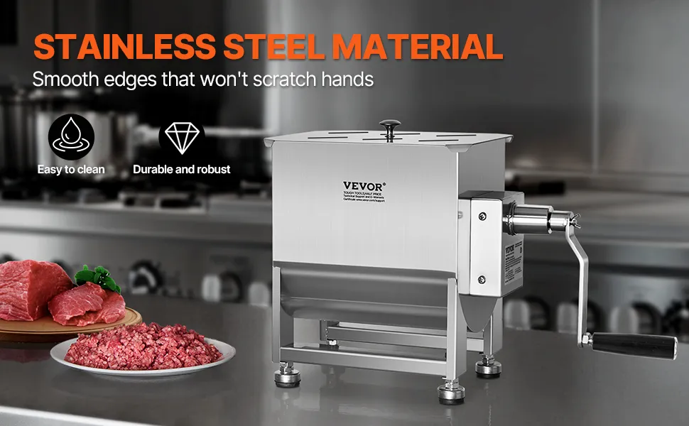 This 30 lbs meat mixer is made of durable 201 stainless steel, ensuring long-lasting strength. It is easy to operate and capable of efficiently mixing large quantities of various meats.