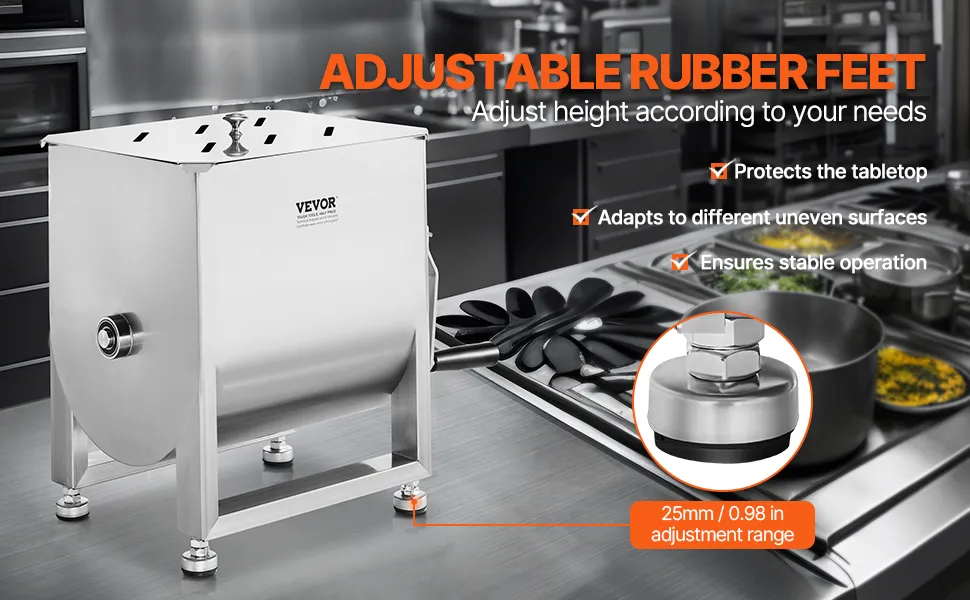 The commercial manual meat mixer is equipped with adjustable rubber feet, providing a height adjustment of 25mm (0.98 in). This design helps protect the surface while ensuring stable operation.
