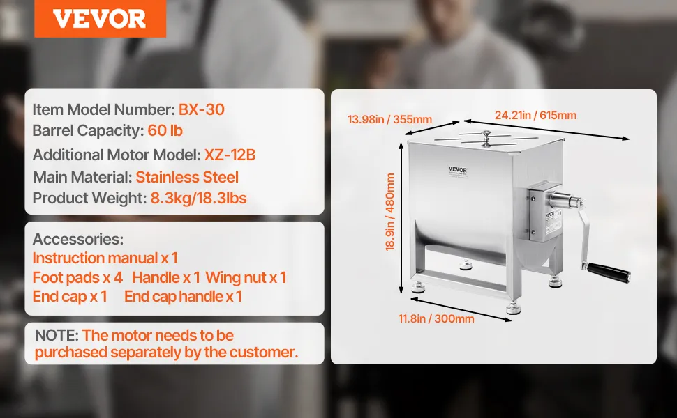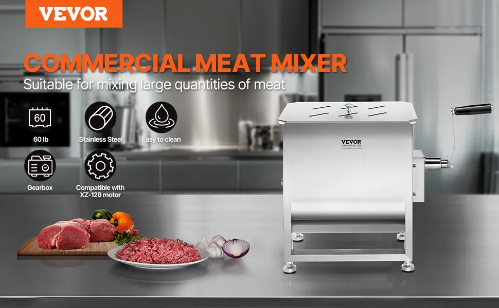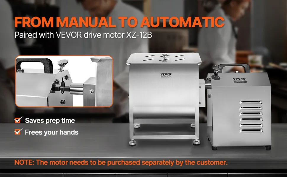 Gearbox Structure: This meat mixer features a gearbox design, making operation more effortless. It is compatible with the VEVOR drive motors XZ-12B, allowing for hands-free operation, so one person can easily handle the task.