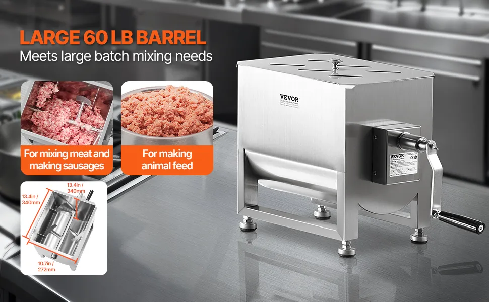 Large Capacity Tank: The 340 x 272 x 340 mm / 13.4 x 10.7 x 13.4 in mixing tank can hold approximately 60 pounds of meat ingredients. It's ideal for large-scale sausage production, other delicacies, or even animal feed preparation.
