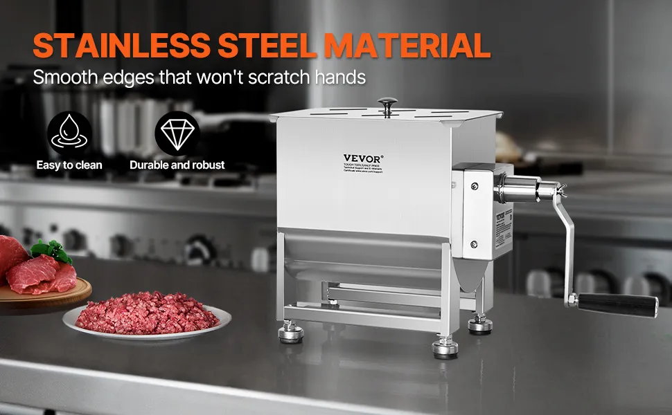This 60 lbs meat mixer is made of durable 201 stainless steel, ensuring long-lasting strength. It is easy to operate and capable of efficiently mixing large quantities of various meats.