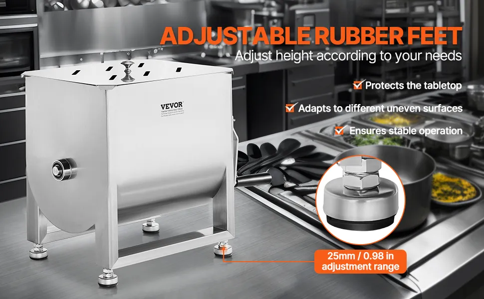 The commercial manual meat mixer is equipped with adjustable rubber feet, providing a height adjustment of 25mm (0.98 in). This design helps protect the surface while ensuring stable operation.