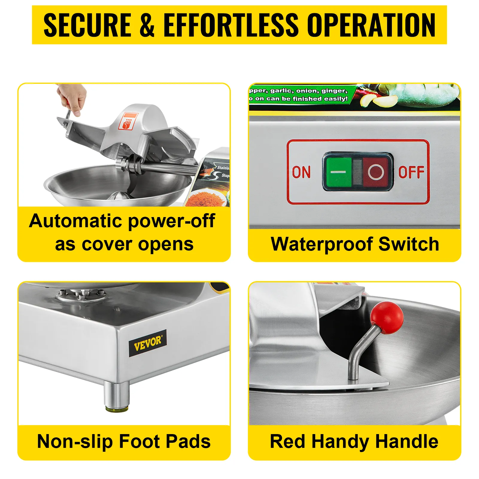 The food chopper features an automatic power-off when the lid is open, water-proof switch, non-slip rubber padded base, convenient red handle, and a semi-close cover design.