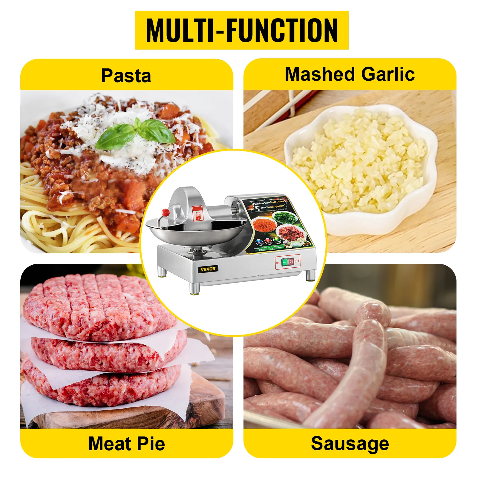 This heavy-duty food processor is perfect for quickly chopping and grinding various meat, vegetables, nuts, and fruits. You can use this machine to make sausages, salad, meat pie, pasta sauce, stuffing, seasoning, baby food, etc.